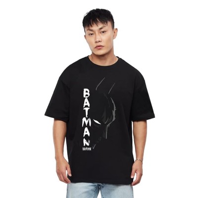 男士半袖超大号T恤,圆领棉混纺落肩印花T恤(黑色)