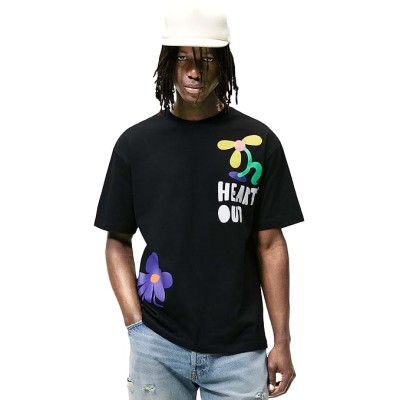 男士半袖超大号T恤,圆领棉混纺落肩印花T恤(黑色)