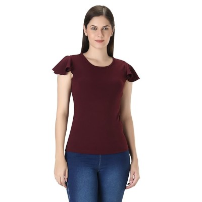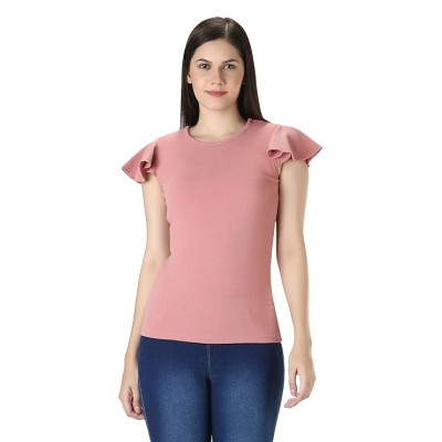 女式时尚休闲上衣,短飘逸袖,圆领牛仔裤时尚款式。