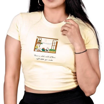 图形新世界主题印花露脐上衣,修身版型,短袖,西式风格,超级舒适透气,100% 纯棉面料,女式露脐上衣 - 米色