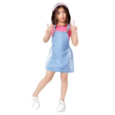 女孩 Pinafore 膝盖以上纯色牛仔连衣裙配 T 恤